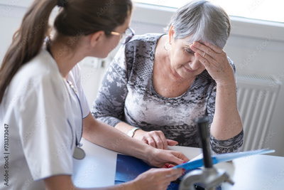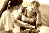 A young doctor examines an elderly patient.