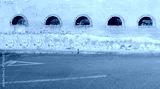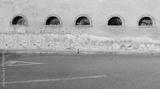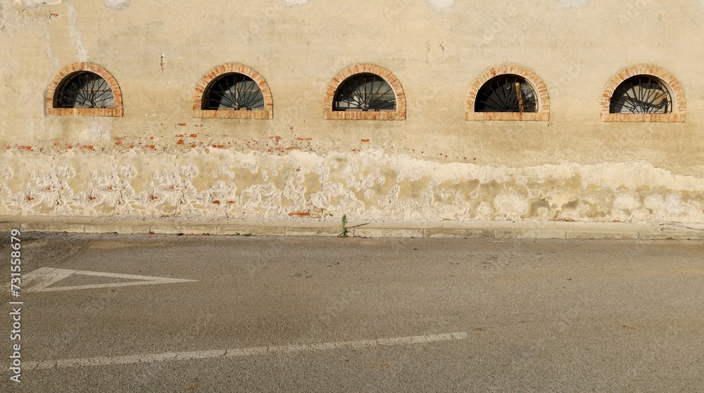 Grunge peeled plaster wall with old semicircular windows. Concrete sidewalk and street in front. Background for copy space.