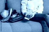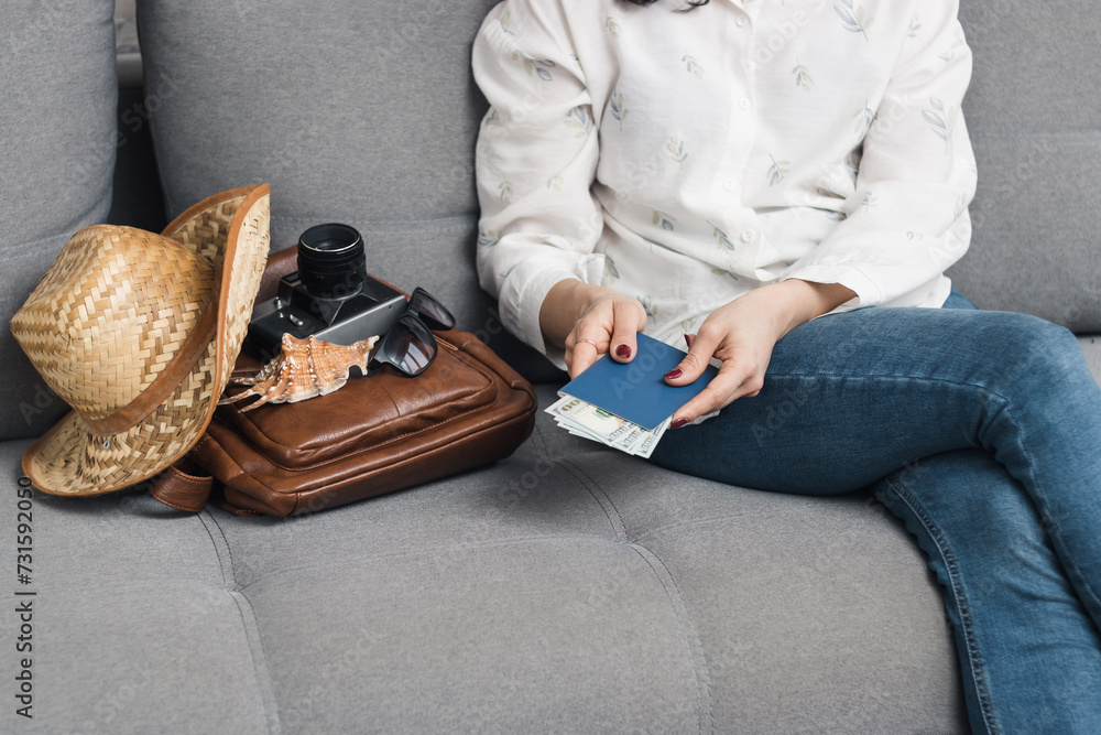 Woman holding passport and dollars cash currency, packing leather backpack with retro camera, straw hat, sunglasses. Concept of traveling and vacations