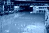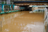 river water flowing fast after the rain with dirty brown water.