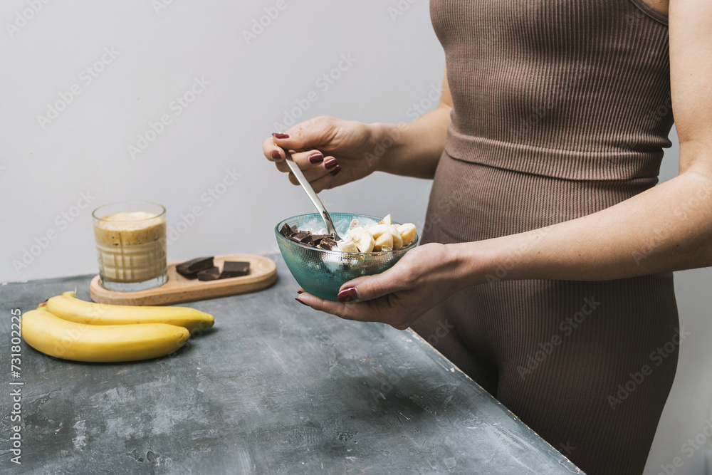 Athletic woman in sportswear eating healthy food for breakfast, cereal, granola, muesli, oatmeal with banana, dark chocolate and yogurt in a bowl
