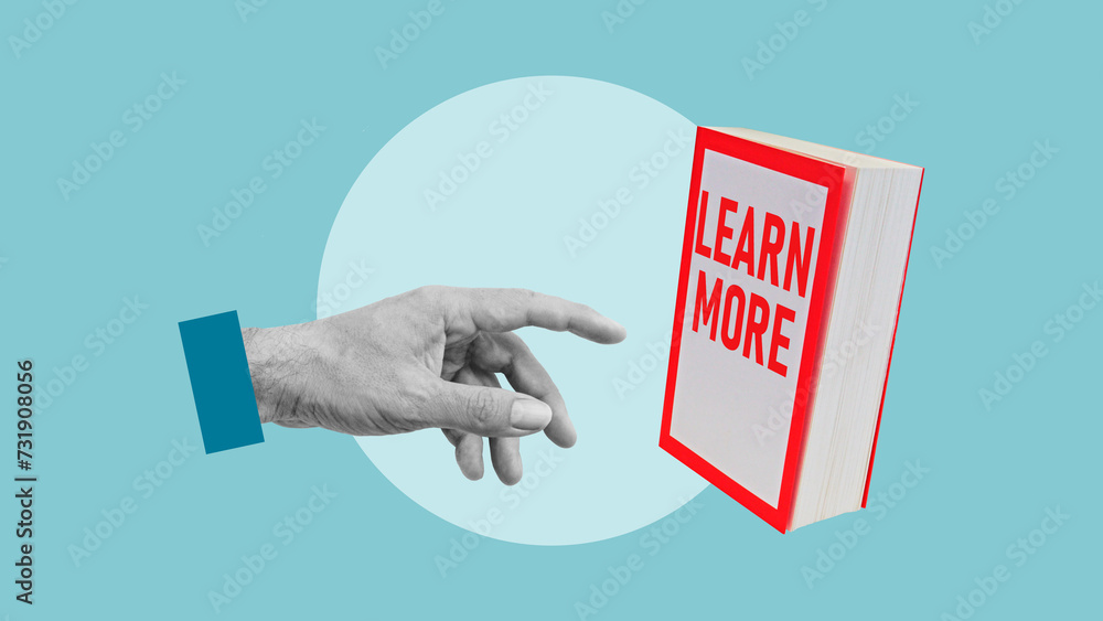Learn more is shown using the text on the book. Collage with the hand and the book