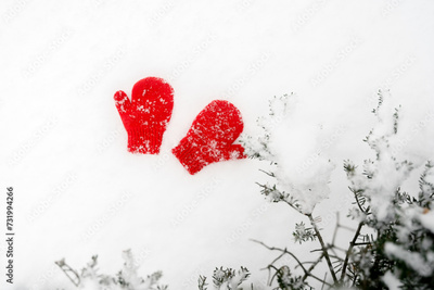 Warm red kid's mittens on a snow in the winter park, a place for text in the snow