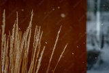 Beautiful natural winter background with twigs and snowflakes on the background of a burgundy building