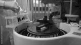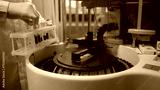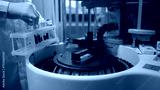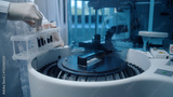 Male scientist puts blood samples from tube rack into modern automatic device for biochemical blood tests analyzing. Professional chemist works in biotechnology laboratory. Advanced research lab.