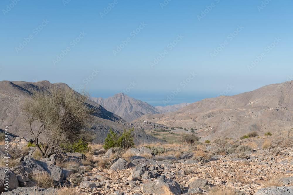 A green valley in the Harim desert mountains of Musandam. Oman
