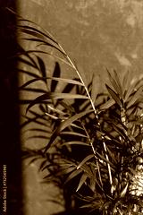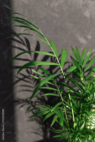 Chamaedorea or Areca palm plant leaves on the black concrete texture background