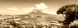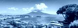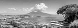 Naples, Italy. View of the Gulf of Naples from the Posillipo hill with Mount Vesuvius far in the background and some pine trees in foreground. Banner header horizontal image. 2021-08-31.