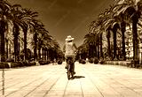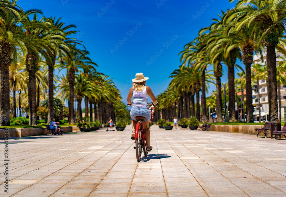 Woman riding bicycle on seaside boulevard Costa Dorada Spain