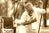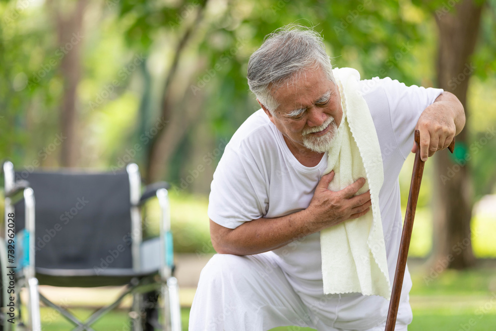 asian senior man suffering and having chest pain from heart attack in the park