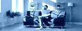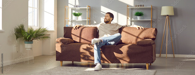 Young man relaxing on a comfortable sofa at home. Happy man sitting on a soft brown couch in a cozy living room interior with modern furniture, house plants and big light windows. Banner background