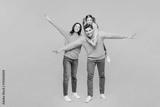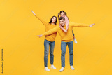 Full body young fun joyful parent mom dad with child kid girl 7-8 years old wear pink sweater casual clothes giving piggyback ride, sit on back isolated on plain yellow background. Family day concept