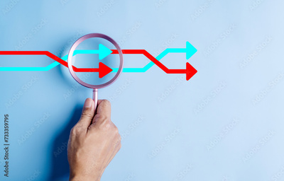 staircase, step, achievement, build, career, development, growth, ladder, plan, progress. hold magnifier to finding correct path between red line or blue line. the concept of choice without people.