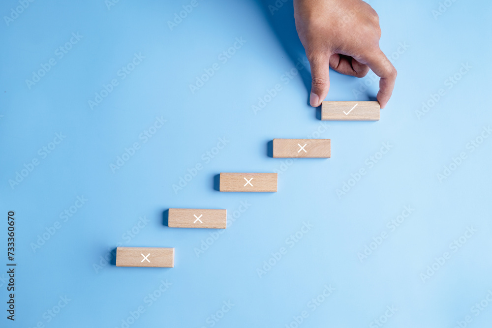 staircase, step, achievement, build, career, development, growth, ladder, plan, progress. use hand pick up the last correct icon put on wooden block of stair. the concept of choice without people.