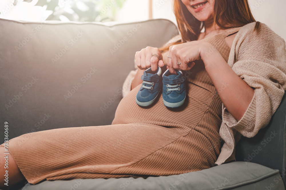 mother, family, maternity, pregnant, woman, pregnancy, baby, motherhood, love, happiness. pregnancy, motherhood, close up of happy pregnant woman and holding small baby shoes sit on sofa and smiling.