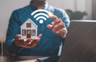 house, property, real, estate, iot, insurance, loan, home, wireless, residential. businessman holding house icon. smart home control concept, smart home and home automation app via wireless tech.