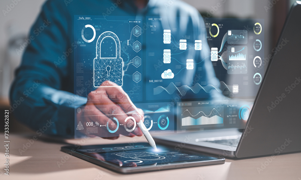 dashboard, security, technology, network, futuristic, interface, innovation, future, control, smart. digital padlock icon, cyber security network and data protection technology on dashboard HUD.