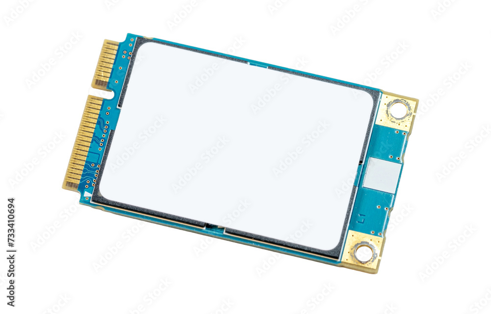 Close-up of a simple mSATA solid-state drive with an unmarked blank empty white sticker, isolated on white background, msata memory card, generic computer chip component object, nobody, no people