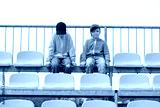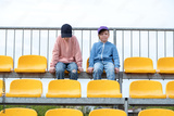 Two young girls, children sitting on stadium seats, bleachers, chairs, empty space, happy cheerful kids on a sports event audience, sport and recreation, two people, lifestyle shot