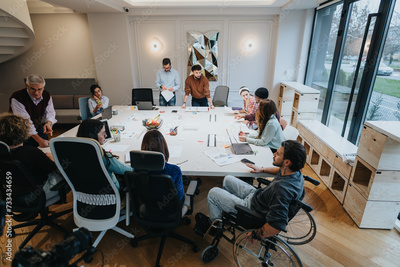 Inclusive business meeting with a diverse team engaged in discussion. A member in a wheelchair actively participating adds to the dynamic.