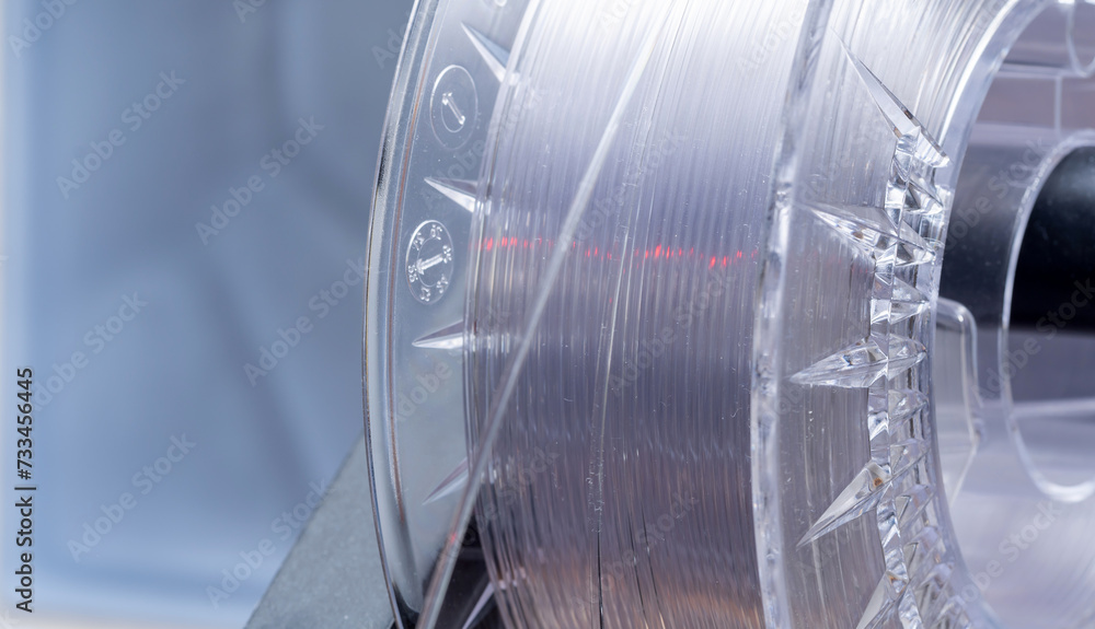 A roll of white transparent high quality 3D printing filament material object structure macro, extreme closeup, nobody. Consumer grade thermoplastic materials used for product prototyping and design