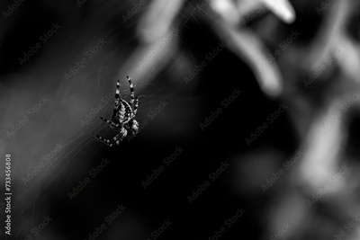 Scary high contrast black and white photo of a spider on its web, macro extreme closeup. Arachnophobia, fear of spiders abstract concept, nobody, copy space Creepy spooky shot, terror, phobias, fears
