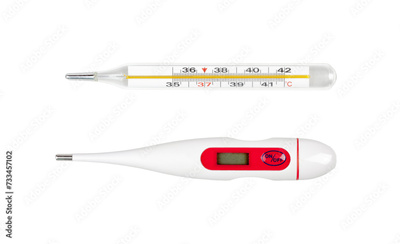 Classic traditional old glass mercury thermometer and a digital electronic one, two different objects isolated on white background, cut out, top view. Temperature measurement instrument simple concept