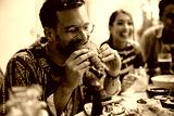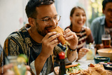 Young man enjoying in taste of tacos while having lunch with friends in restaurant.