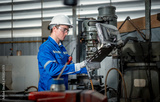 Industry engineer worker wearing safety uniform control operating computer controlled Lathe grinding machine working in industry factory is metal manufacturing industry concept.