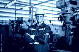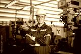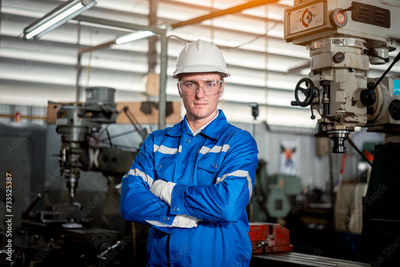 Portrait industry engineer wearing safety uniform control operating lathe grinding machine working in industry factory is metal manufacture industry concept.
