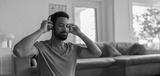 Young man with closed eyes, listening meditating music at home. Morning or evening workout routine, listening to music through wireless headphones.