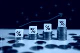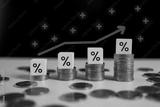 Economic crash and inflation. Interest rates symbol. A wooden cube with an arrow symbolizes that the interest rates are going up. Business interest rates concept