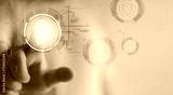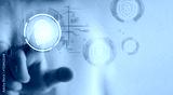 Digital fingerprint Verification. Man touching digital scanning fingermark for authorization access data, fingerprint scanning for identity verification