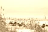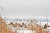 Overgrown dry cattail in winter. Herbaceous plants of lakes, marshes and rivers with brown cylindrical inflorescence. Selective focus.