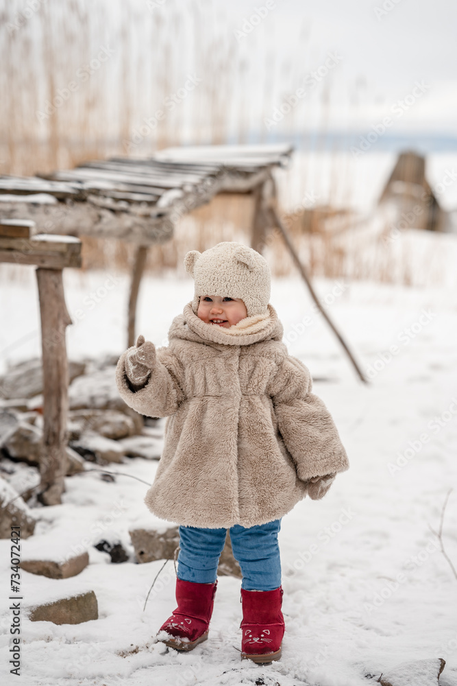 Cute little baby child toddler in a plush hat and fur coat on a snowy winter landscape with reeds. A cozy winter season, an active childhood, the baby looks like a teddy bear