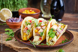 Mexican tacos with chicken meat, corn and salsa. Healthy tacos. Diet menu. Mexican taco.
