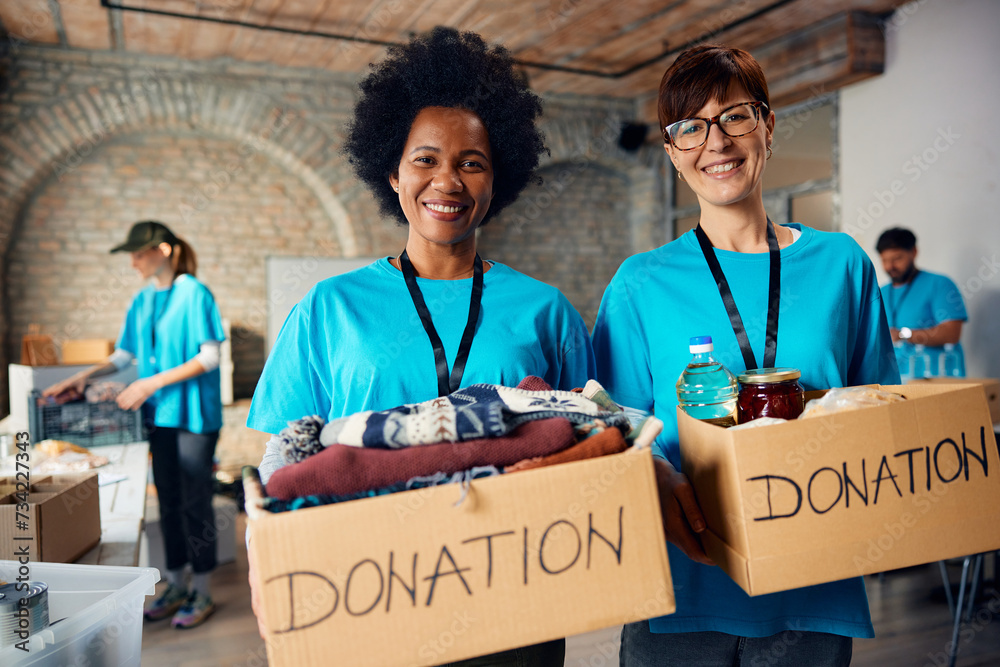 Happy female volunteers with donation boxes at humanitarian aid center looking at camera.