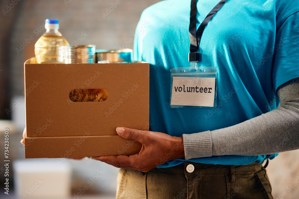 Unrecognizable female volunteer with donation box at food bank.