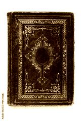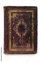 Old skin book cover with embossed golden abstract pattern and floral decorations isolate on white background. Abstract vintage decorations 19th century.