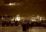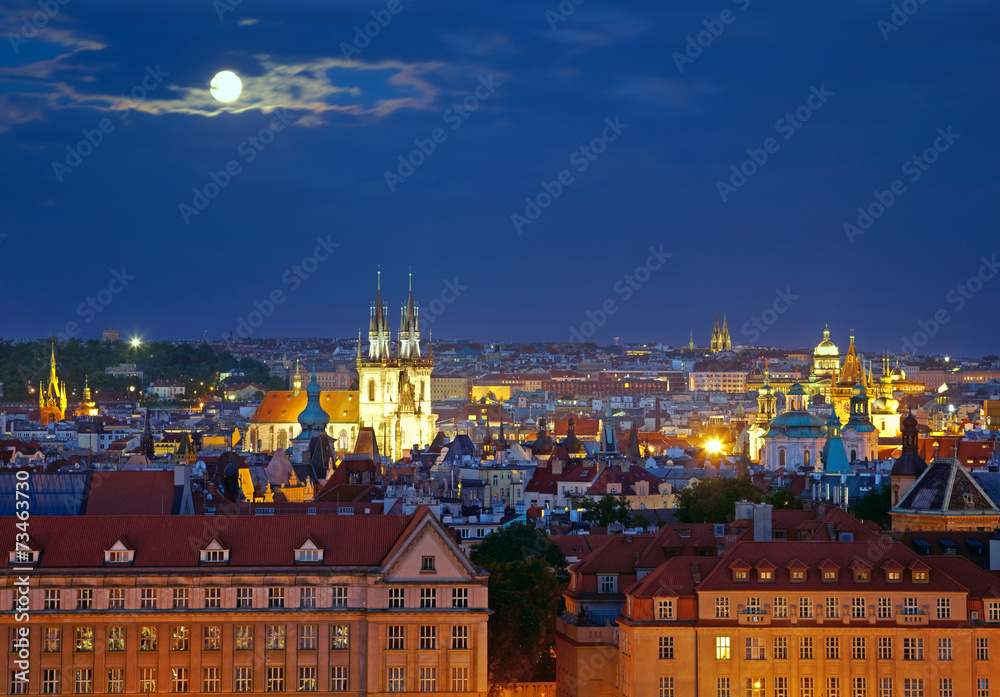 Prague cityscape at night time with full moon