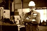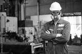 technician or worker wearing gas mask in the factory