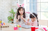 Asian cute little children girl wearing funny bunny ears headbands and young happy mother smile decorating painting eggs while sitting together in living room table family preparing for Easter holiday