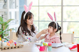 Close up shot asian young mother and her little cute daughter looking at her mom with loving eyes while her mum helped put on bunny ears headband in living room, Happy family preparing for Easter.