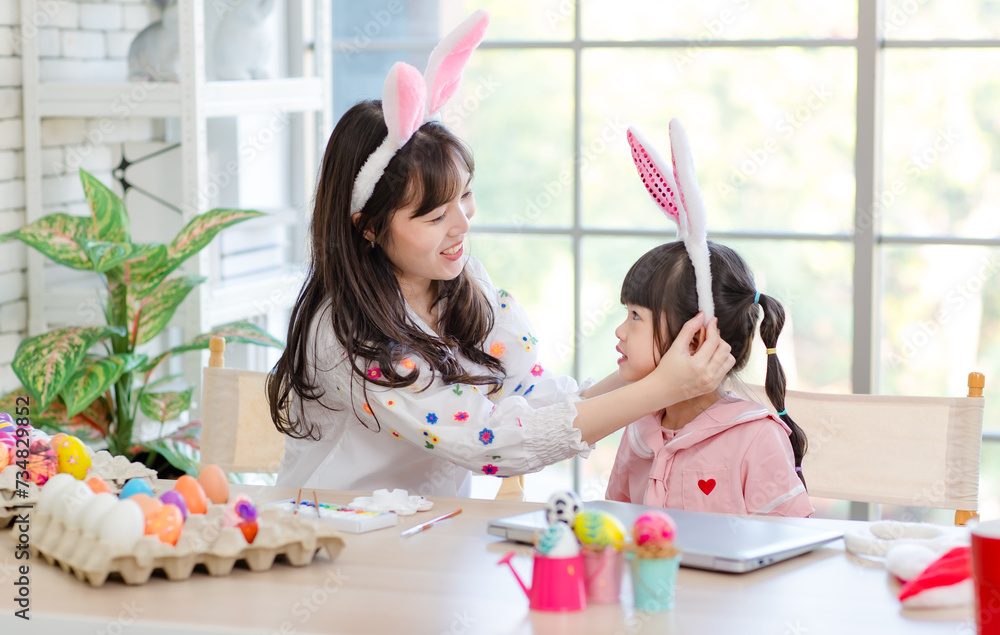 Close up shot asian young mother and her little cute daughter looking at her mom with loving eyes while her mum helped put on bunny ears headband in living room, Happy family preparing for Easter.