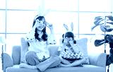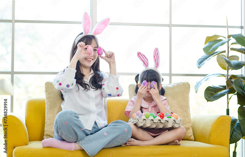 Asian cute little children girl wearing funny bunny ears headbands and young happy mother smile decorating painting eggs while sitting together on sofa in living room, Family preparing Easter holiday.