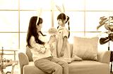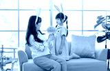 Asian cute little daughter girl is congratulating her pretty mother and giving flowers pink roses. Mum and girl smile loving happy, Family holiday and togetherness, Mother's Day celebration.