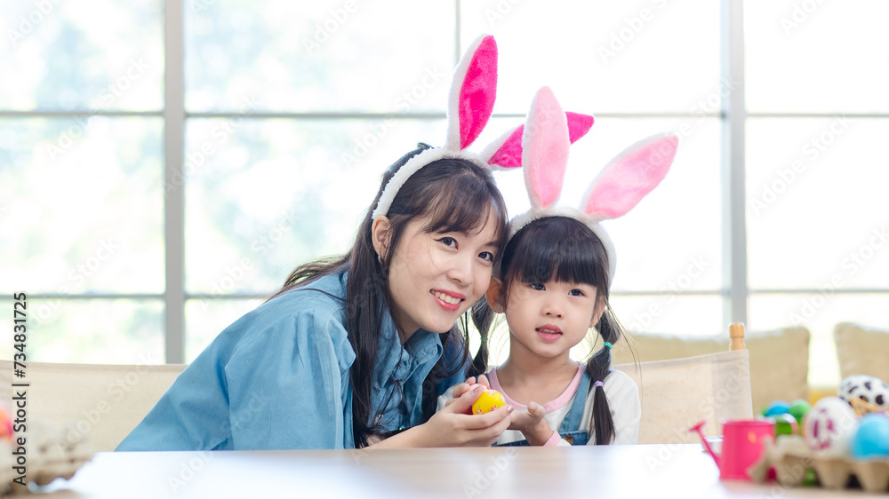 Asian cute little children girl wearing funny bunny ears headbands and young happy mother smile decorating painting eggs while sitting together in living room table family preparing for Easter holiday