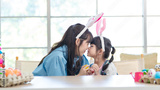 Asian cute little children girl wearing funny bunny ears headbands and young happy mother smile decorating painting eggs while sitting together in living room table family preparing for Easter holiday