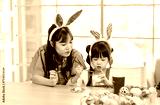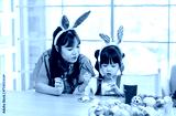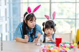 Asian cute little children girl wearing funny bunny ears headbands and young happy mother smile decorating painting eggs while sitting together in living room table family preparing for Easter holiday