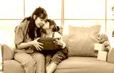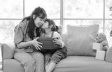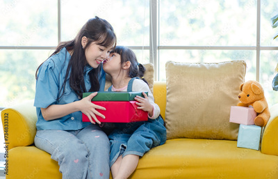 Happy mother's day Asian little cute girl child congratulating mom. Young mother and daughter smiling and holding gift on yellow cozy sofa in living room at home, Family holiday and togetherness.